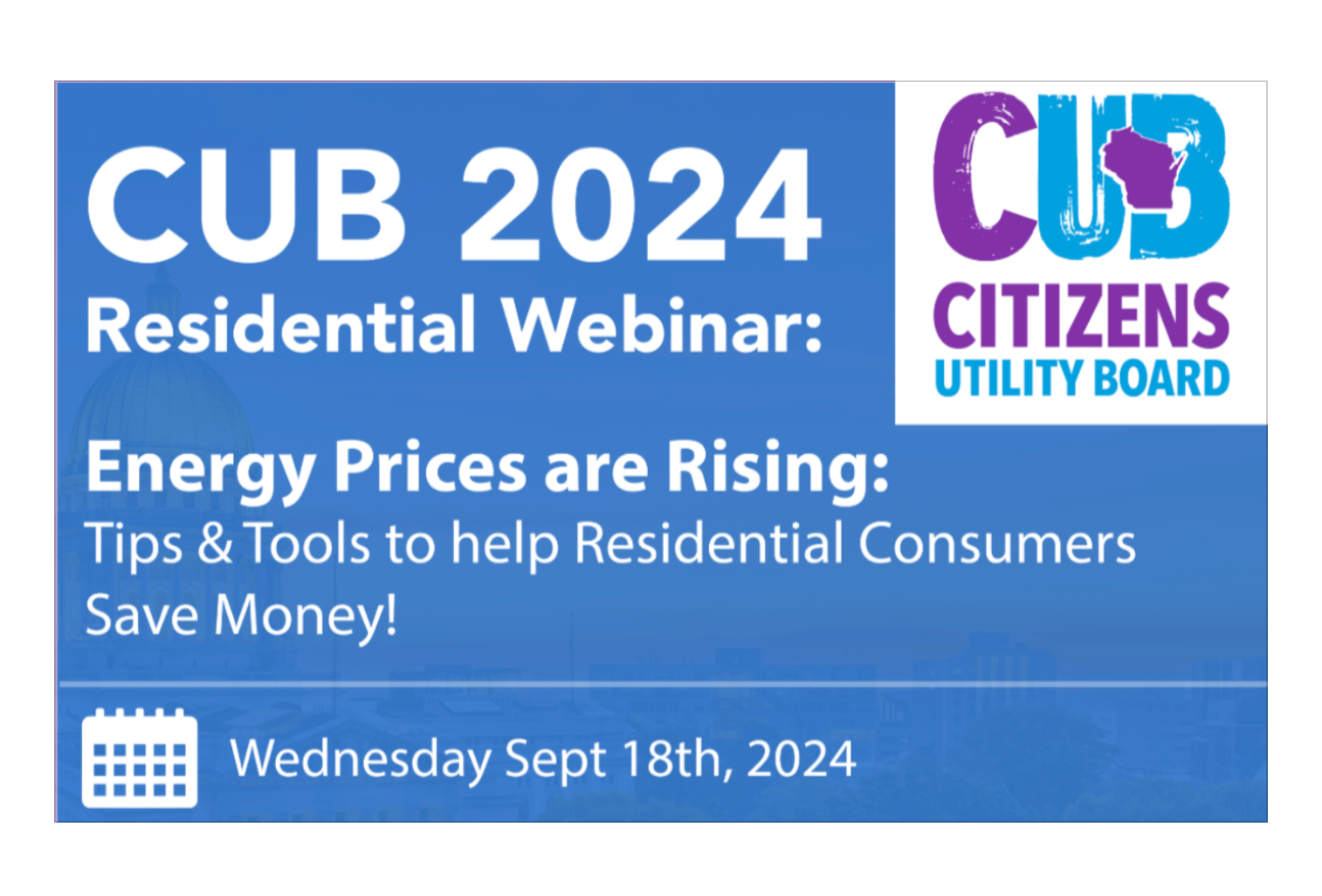 Join the Citizens Utility Board of Wisconsin for an educational webinar covering all the tools, resources and programs that are available for residential consumers (both homeowners and renters) to address the rising costs of energy.  This webinar will unpack Wisconsin’s Focus on Energy program, the new instant rebates that are coming for furnace or HVAC systems, as well as everything covered under the HOMES program of the Inflation Reduction Act.  The CUB team will spotlight ways for Wisconsin utility customers to get involved in helping to shape our energy democracy. This is a conversation you don’t want to miss!