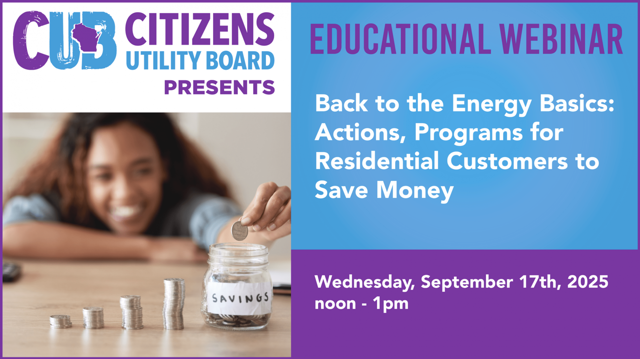 Join the Citizens Utility Board of Wisconsin for an educational webinar designed to empower Wisconsin residential utility customers with knowledge and actionable strategies to help them save money. The webinar will offer a comprehensive understanding of utility-related issues, from foundational concepts to practical energy-saving measures and programs. Register Here